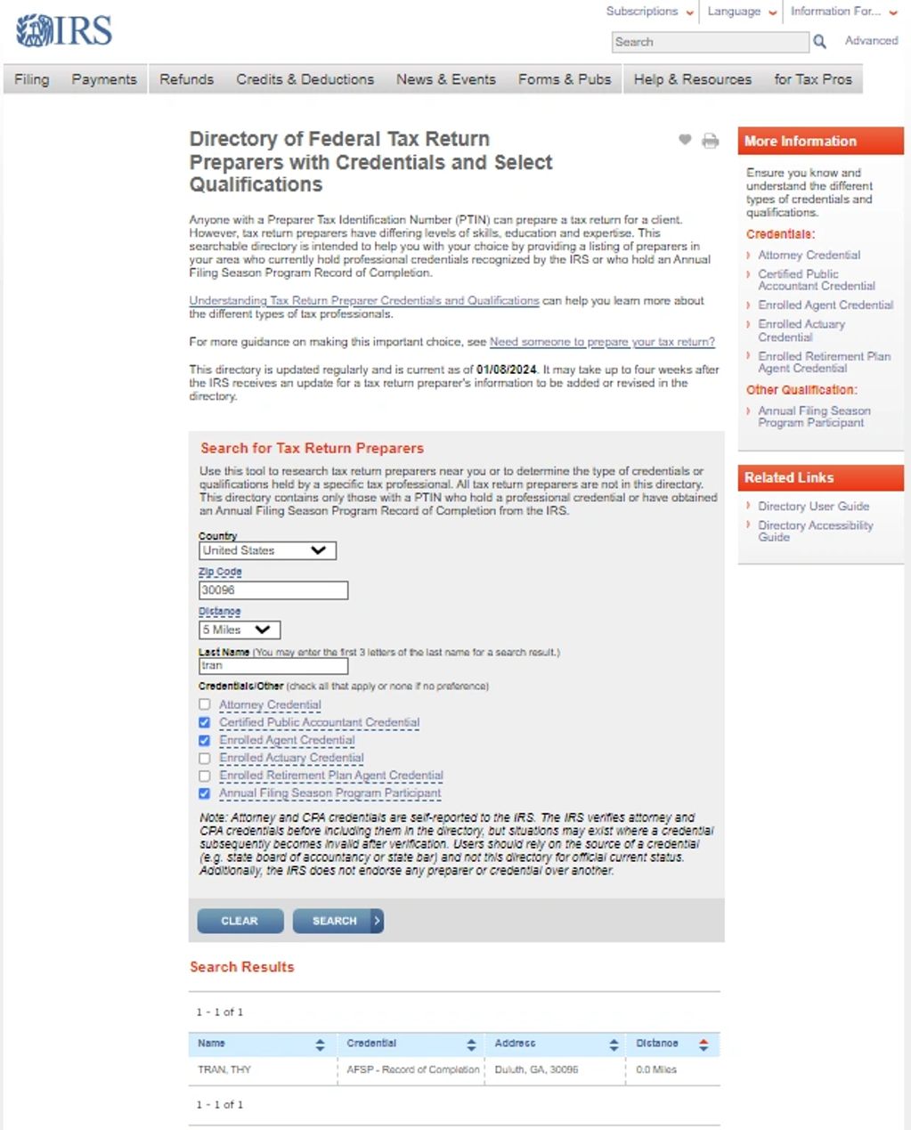 Choosing a tax pro: People can use the IRS Directory of Federal Tax Return Preparers with Credentials and Select Qualifications to find a preparer who is skilled in tax preparation and accurately files income tax returns. Choosing the wrong tax return preparer hurts taxpayers financially every year. Be sure to check tips for choosing a tax preparer and how to